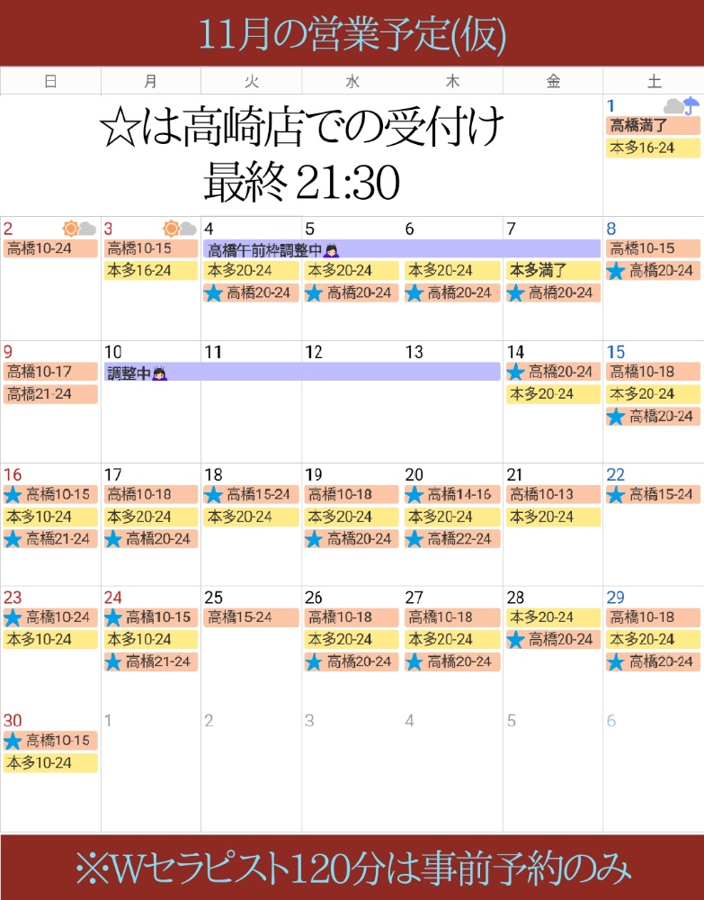 | 営業時間 | 10:00~24:00(受付け8:30~21:30) |