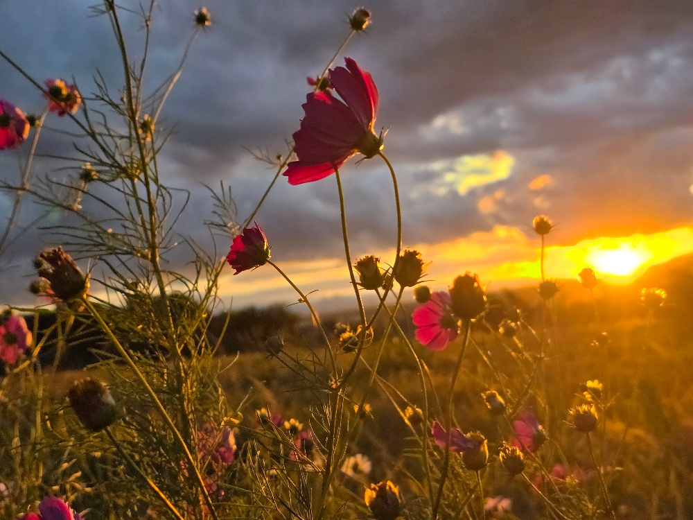 先日の美しい夕陽をバックに、コスモスがとても綺麗でした。